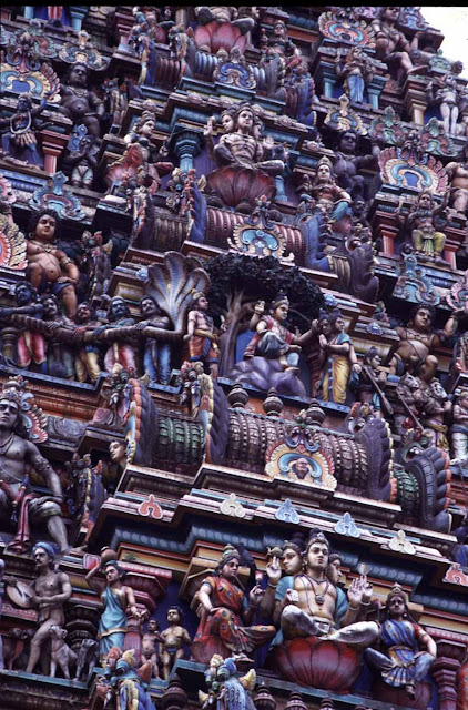 ヒンドゥー建築の世界は、神々のパンテオンである。様々な図像が鏤められていて、細部はめくるめくほど過剰である。神は細部に宿るというけれど、神々で満ちあふれている。その空間を味わうためには、その神々について思い描く必要がある。手掛かりとなるのは、神像の持ち物、着物、乗り物である。また、神々の関係(家族、化身)である。神像は普通4本の手を持ち、それぞれ固有の持ち物を持っている。また、独特の着衣、髪飾り、首飾りをしている。そして、神々は固有の乗り物(ヴァーハナ)として特定の動物と関連づけられている。