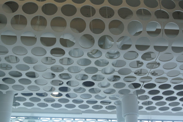 まずはプログラムと審査委員会がすぐれていた、というべきであろう。130の応募者があったというが、コンヴァージョンということで若手建築家も提案しやすかったと思う。既存建物の緩やかな曲線状の外形は、特注の穴の空いたアルミパネルで覆って衣替えさせた。美術館内部は、既存建物を裸にした上で、全体を周遊する空間構成として、様々なヴォリュームの展示室やプロムナードを巧みに配した。大小の開口部を介して空間相互の関係を視覚的に連結する手法は一貫して追求されている(図⑥abcd)。