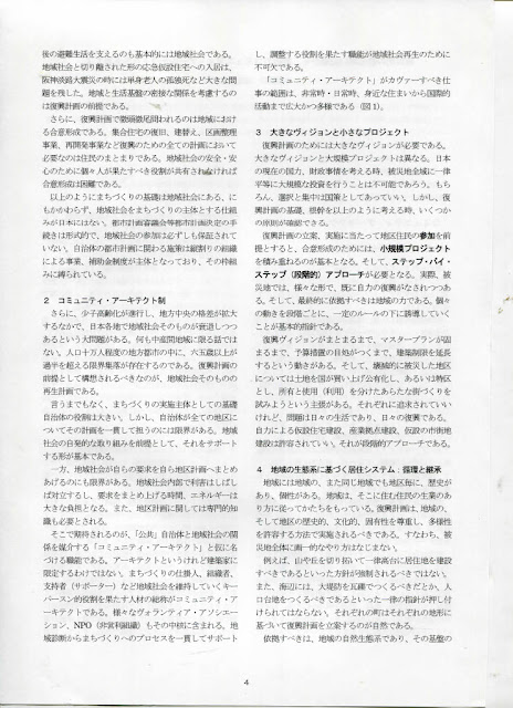 復興は、単なる復旧であってはならず、日本再生、地域社会再生のためのシステム構築でなければならない。復興計画は、自立循環型地域社会(エコハウス、エコヴィレッジ、エコタウン)の具体的な空間のあり方、その形態とそれを実現する仕組みにわかれるが、前者を自ら提案、選び取るのは地域社会であるという仕組みこそが重要であり、地域住民の日常生活を支える持続的な仕組みの構築こそを復興計画の中に組み込むというのが本論の骨子である。